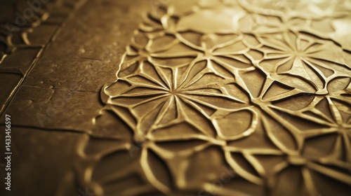 gold, metallic, embossed, pattern, texture, detail, surface, ornate, geometric, design, decoration, floral, abstract, art, craft, vintage, antique, aged, relief, repeating, background, style, elegant, luxury, intricate, symmetry, light, shadow, highlight, shallow, sharpened, shape, cut-out, engraved, delicate, crafted, panel, smooth, material, architectural, decorative, bronze, finish, metal, warm, radial, faceted