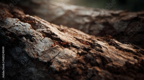A detailed close up of a tree trunk s rugged bark highlighted by diffused sunlight as a colony of small red ants actively navigates its intricate