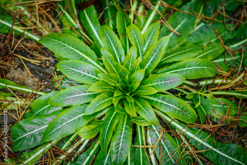 A detailed close-up of a green plant with lush leaves spreading on the forest floor, surrounded by pine needles. The vibrant leaf veins and natural textures create a fresh, earthy scene.