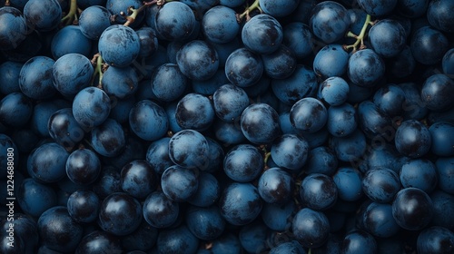 A detailed close-up of a large pile of ripe blue grapes, showing their rich color and natural texture. Ideal for food, wine, and health-related themes.