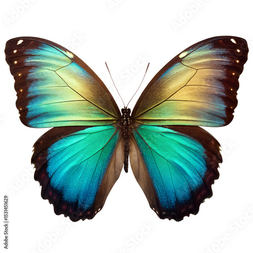A Detailed Close-up of a Morpho Butterfly with Vibrant Blue and Green Wings Against a Black Background