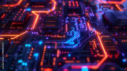 A detailed close-up of a printed circuit board features colorful illuminated pathways and electronic components, showcasing a high-tech design for technology.