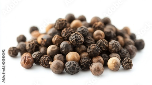 A detailed close-up view of black pepper seeds arranged neatly on a clean white surface, highlighting their texture and color.