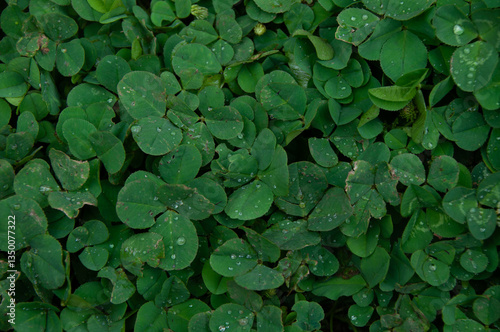 A detailed full frame close-up of clover leaves adorned with water droplets. Making a beautiful background and displaying the freshness and tranquility of nature after a rain.