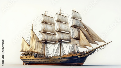 A detailed illustration of a sailing ship with multiple masts, showcasing nautical design and artistry.