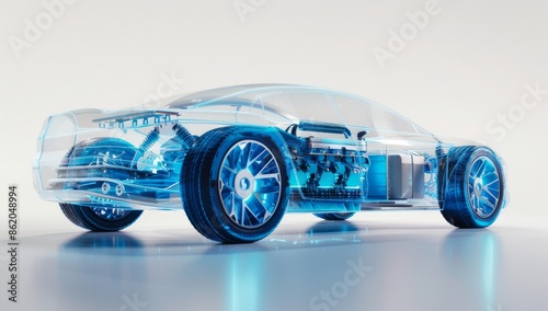 A detailed illustration of an electric car's internal structure, showcasing the battery and motor inside its transparent shell.