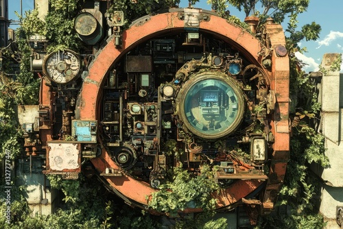 architecture, metal, rust, clock, gear, circuit, wire, plant, nature, overgrown, mechanism, round, frame, detail, technology, machinery, design, structure, equipment, construction, window, dial, gauge, display, panel, screen, monitor, antique, vintage, engineering, device, component, time, green, wall, texture, surface, complex, intricate, aesthetic, futuristic, science, fantasy, art, weathered, industrial, outside