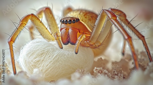 A detailed macro image of a spider protecting its egg sac, showing intricate details.