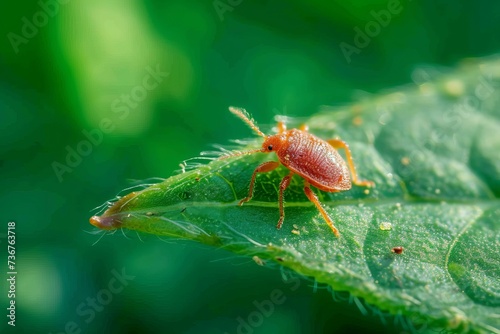A detailed macro shot capturing the intricate details of a beetle exploring the surface of a vivid green leaf