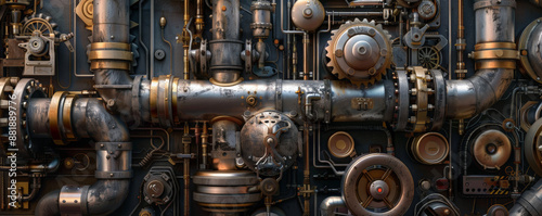 A detailed mechanical background with a focus on steam engines and their components, including pistons, valves, and boilers, evoking a sense of vintage engineering.