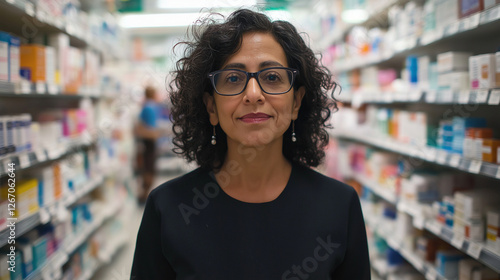 A detailed portrait of a Latin woman in her 50s with curly hair, glasses, and a kind expression, standing in a well-lit pharmacy aisle.