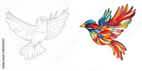 A detailed presentation of a bird in flight, illustrating the evolution from a simple sketch on the left to a colorful, stylized version on the right