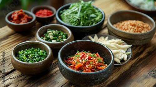 A detailed shot of a handmade ceramic bowl of with its vibrant color and texture highlighted, set against a rustic wooden table with Thai condiments.