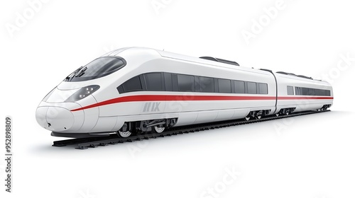 A detailed stock photo of a white high-speed train isolated on a white background. The train’s modern and aerodynamic design is prominently displayed, suitable for transportation and travel themes.