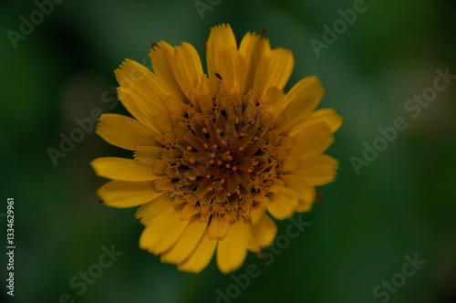 A detailed view of a bright Meadow Goats Beard yellow flower in full bloom with a rich green soft focus backdrop conveying nature's beauty.