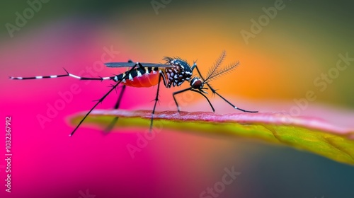 A Detailed View of a Mosquito Resting on a Leaf in a Tropical Forest, Highlighting Its Crucial Role in Virus Transmission, with a Shallow Depth of Field Creating a Dramatic Effect.
