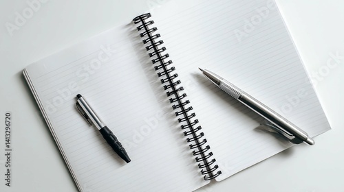 A detailed view of a notebook with two pens, ready for writing on a blank page.