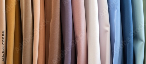 A detailed view of a range of multicolored fabrics hanging neatly on a stand