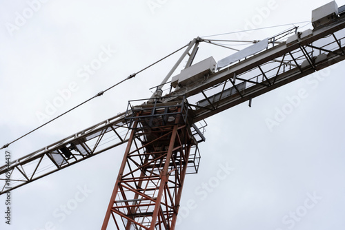 A detailed view of a tall construction crane against a pale sky. The photograph emphasizes the geometric structure of the crane, showcasing its intricate design and industrial purpose.
