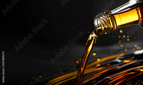 A detailed view of yellow transparent liquid pouring out of the neck of glass bottle at black background.