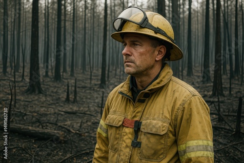 firefighter, wildfire, forest, destruction, nature, autumn, courage, recovery, smoke, charred, resilience, danger, environment, standing, survival, tree, impact, heroism, ash, landscape, protection, bravery, emergency, safety, heat, clearing, aftermath, commitment, vigilance, service, duty, training, community, hope, mission, teamwork, ecology, support, urgency, adventure, response, wilderness, temperature, combat, persistence, strength, generative, ai