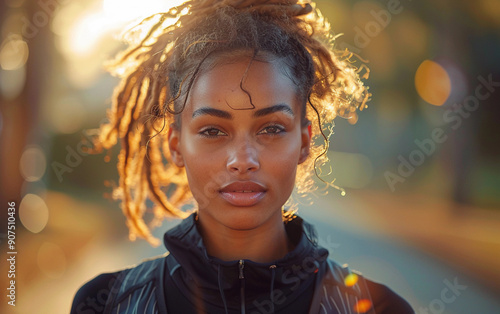 A determined Mixed Race person participates in a marathon, surrounded by vibrant city scenery illuminated by the early morning sun