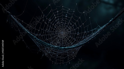 A dewy spiderweb hangs, with a soft golden light behind it.