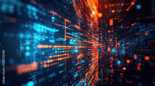 A digital abstract representation showcasing vibrant blue and orange lines, symbolizing data flow and technology interaction in a futuristic environment.