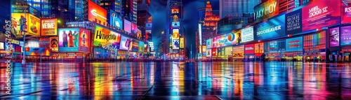 A digital cityscape where skyscrapers are covered in neonlit screens, and virtual billboards project interactive ads into the night sky