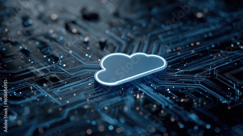 A digital cloud icon glows on a circuit board, symbolizing data storage