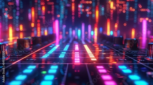 A digital equalizer with pulsating neon lights, cyberpunk style, dark background, vivid colors