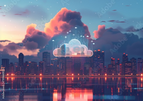A digital illustration of cloud computing technology with icons and graphs, set against the backdrop of an urban skyline at dusk creates a sense of modernity in business and data Generative AI