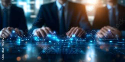 A digital interface with glowing data visualizations and business professionals in suits, suggesting a focus on technology and analytics. Concept Digital Interface Design