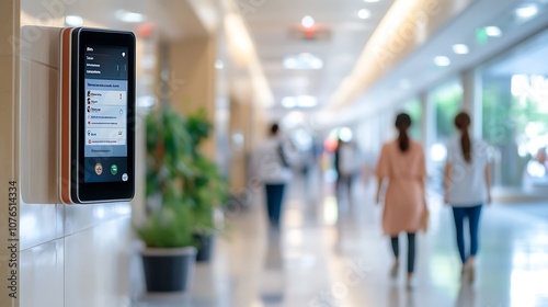 wall, modern, hallway, corridor, office, business, digital, kiosk, screen, display, technology, interior, design, architecture, building, people, walking, professional, corporate, contemporary, white, bright, clean, sterile, security, access, control, interface, user, information, signage, touch screen, touch screen, interactive, monitor, future, innovation, automation, smart