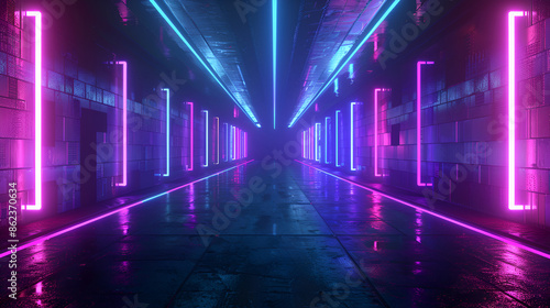 A digital rendering of a futuristic corridor with pink and blue neon lights, Explore a neon tunnel filled with vibrant colors, ideal for futuristic tech visuals and modern artistic ambiance