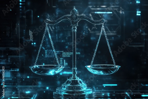 A digital rendering of the Scales of Justice, placed in a futuristic setting