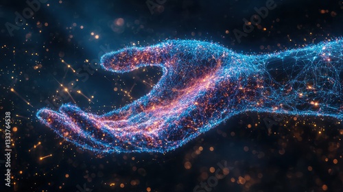 hand, digital, abstract, blue, orange, particle, light, glow, space, network, connection, futuristic, cosmic, aethereal, energy, concept, art, design, technology, illustration, render, galaxy, universe, bokeh, shape, form, bright, vibrant, datum, line, point, structure, pattern, modern, creative, dynamic, airy, fluid, aglow, star, stellar, movement, creation, visualisation, composition, sphere, round, nebulous
