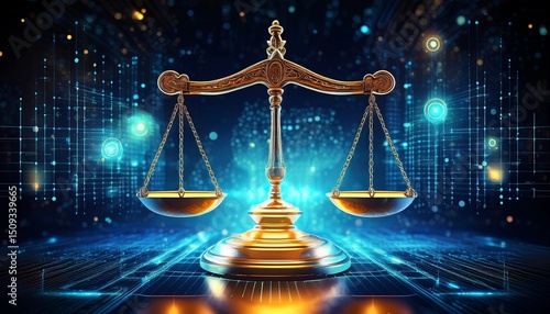 a digital representation of justice featuring a golden balance scale against a backdrop of glowing data and technology symbols