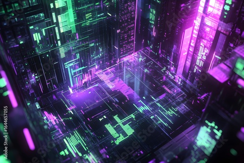 A digital stock market chart with purple and green lights, displaying candlestick charts in the background. The scene is captured from an overhead perspective,