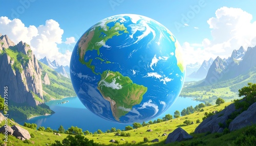 earth, globe, planet, earth, sphere, blue, green, nature, landscape, mountain, lake, field, sky, cloud, tree, grass, scenic, environment, outdoors, daytime, sunlight, vale, hill, rock, beautiful, view, illustration, cartoon, digital, render, peaceful, tranquil, vibrant, bright, clear, fresh, airy, huge, global, atmosphere, ecology, conservation, travel, explore, discovery, space, wonder, horizon