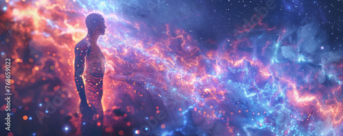 A digitized human silhouette is integrated into an intricate network of luminous data streams, surrounded by celestial auroras and cosmic phenomen.