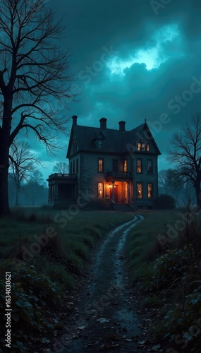 A dimly lit, abandoned mansion silhouetted against a stormy sky; long shadows stretch across decaying grounds, creating a chilling atmosphere of mystery and suspense , graveyard, overgrown, gothic