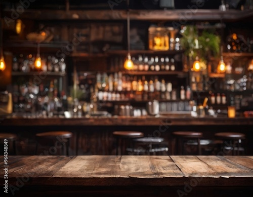 A dimly lit bar with a wooden bar counter, stools, and shelves filled with various bottles and glasses, with a blurred background.