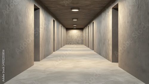A dimly lit corridor with concrete walls and multiple doorways, creating a sense of depth and minimalism.