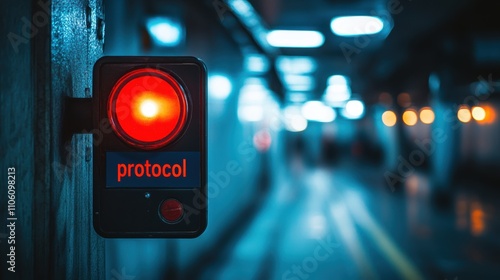A dimly lit hallway in an industrial setting is captured with a close-up focus on a red warning sign labeled "protocol," indicating caution or procedure.