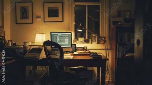 A dimly lit home office with a large wooden desk, a comfortable chair, and a computer. There are bookshelves, pictures, and other decorations on the walls.