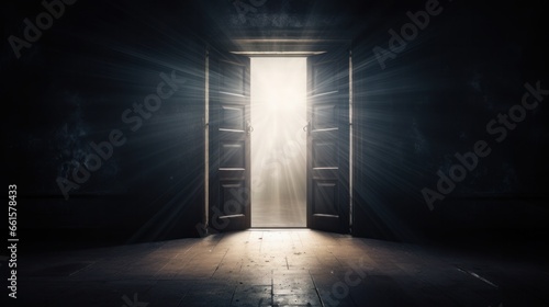 A dimly lit room with light streaming in through an open door, symbolizing new opportunities, hope, the ability to overcome challenges, and the concept of finding solutions