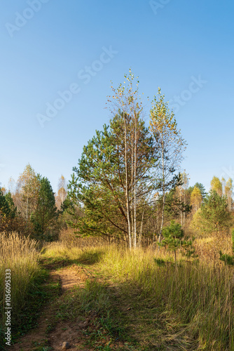 forest, tree, path, wood, timberland, trail, dirt road, grass, tall grass, forest floor, foliage, green, brown, yellow, sunlight, autumn, fall, nature, outdoors, landscape, rural, country, wilderness, scenic, peaceful, quiet, serene, tranquil, natural, untouched, secluded, hidden, rustic, wild, beauty, brilliancy, vibrant, colours, gold, light, shadow, depth, perspective, winding, journey, adventure, discovery
