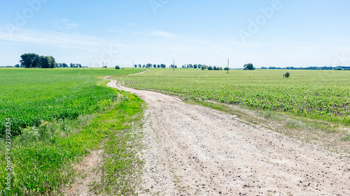 A dirt rural road in an agricultural field. Winding country road and green farmland.