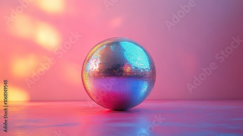 A disco ball reflecting rainbow colors, set against a pastel backdrop, capturing the retro party vibe and energy of a music and dance celebration.